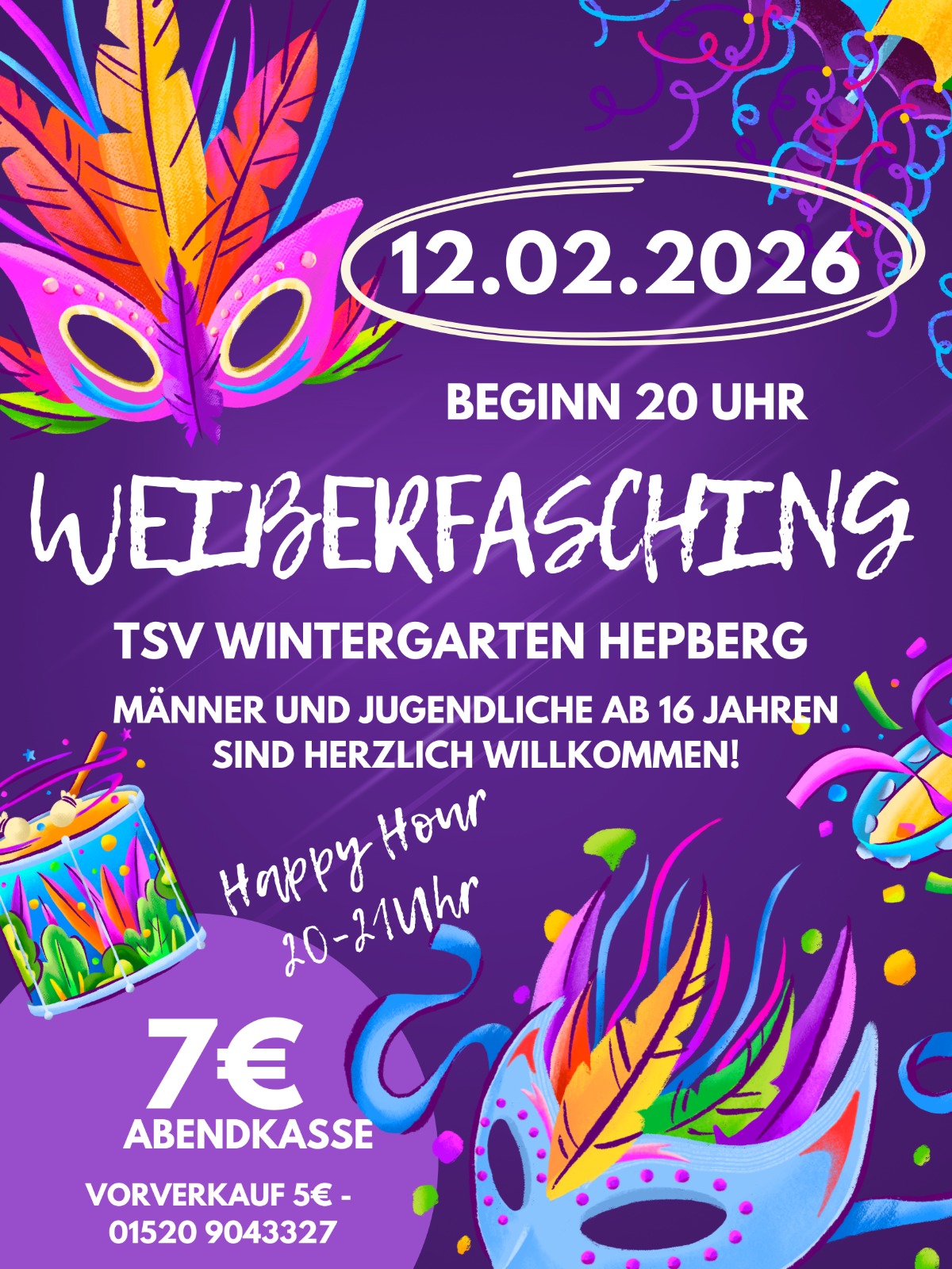 Am 20.02.2020 findet in der Jurahalle in Hepberg der erste Weiberfasching der FHB statt. Für die musikalische Unterhaltung sorgt DJ Chris.